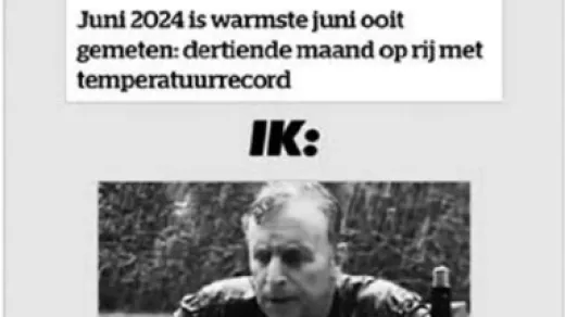 Het probleem is dat dat geredeneer nu ook een platform krijgt online en steeds meer doorgaat als ‘kritisch denken’ en ‘je eigen onderzoek doen’. Redeneren wordt gelijkgeschakeld met zogenaamd ‘DE waarheid’ durven verkondigen, terwijl ‘de wetenschap’ helemaal inboet aan legitimiteit. De comment dat de gebruiker voor het eerst een trui aan moest in juni, krijgt 333 likes in twee dagen tijd. Het is een van de opmerkingen die vandaag door velen gezien wordt als common sense, meer nog, als echte kennis. Klimaat is immers al vele jaren een politiek strijdtoneel. En het is alweer geen toeval dat men op extreemrechts vooral de aanval inzet op ‘rationele kennis’. Bart Claes van Vlaams Belang was er bijvoorbeeld als de kippen bij om de draak te steken met deze klimaatberichtgeving. Het contrast tussen de gif van een man die in gietende regen probeert zijn soep te eten en wijn te drinken en de titel over de warmste juni is uiteraard grappig.